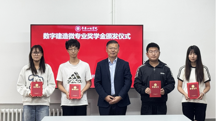仪式伊始,韩风毅院长为2401班新一批4名通过国家BIM技能等级考试的优秀学生颁发奖学金,至此,我院数字建造微专业2401班已累计有14人次获此殊荣。韩院长表彰他们“课余坚持训练、以赛促学、以考验效”,为专业交叉融合交出亮眼答卷。这一环节既是对获奖者的肯定,也为新学员树立了可见、可学的榜样。