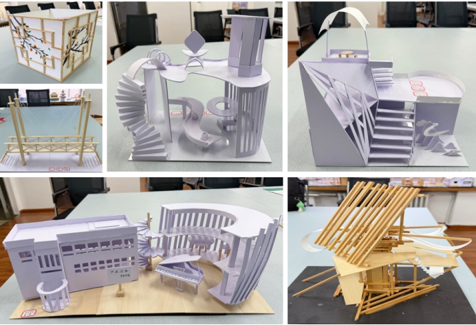 依据BIM模型,学生使用木条、PVC板等材料进行切割与组装,完成实体模型的制作,体验从数字设计到实物落地的完整流程。