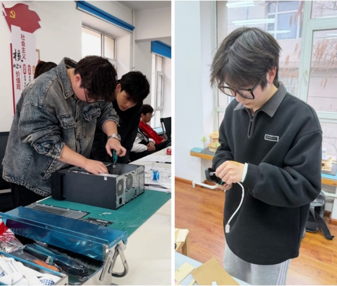学生在教师指导下学习计算机硬件知识,动手拆装主机、网线制作,掌握信息技术基础技能,建立系统化操作认知。